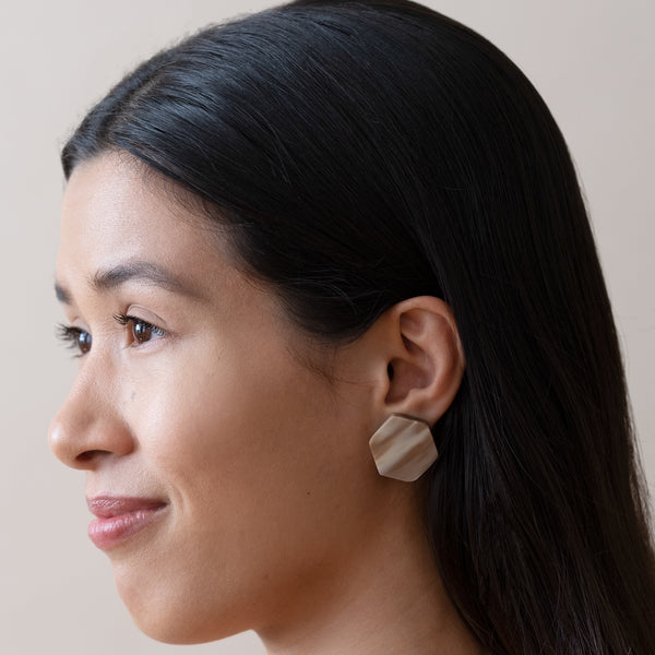 Sweet as a honey bee! These hand carved and polished cow horn post earrings are a simple and sweet honeycomb design. Assorted color tones.